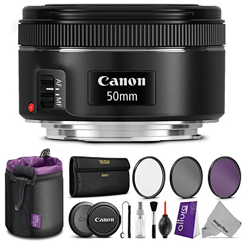 - INCLUDES: Canon EF 50mm f/1.8 STM Standard & Medium Telephoto Lens + Vivitar 49mm 3 Piece Filter Kit (UV-CPL-FLD) + Altura Photo Small Neoprene Lens Pouch + Lens Cap Keeper Holder + Altura Photo Cleaning Kit + MagicFiber Microfiber Cleaning Cloth.